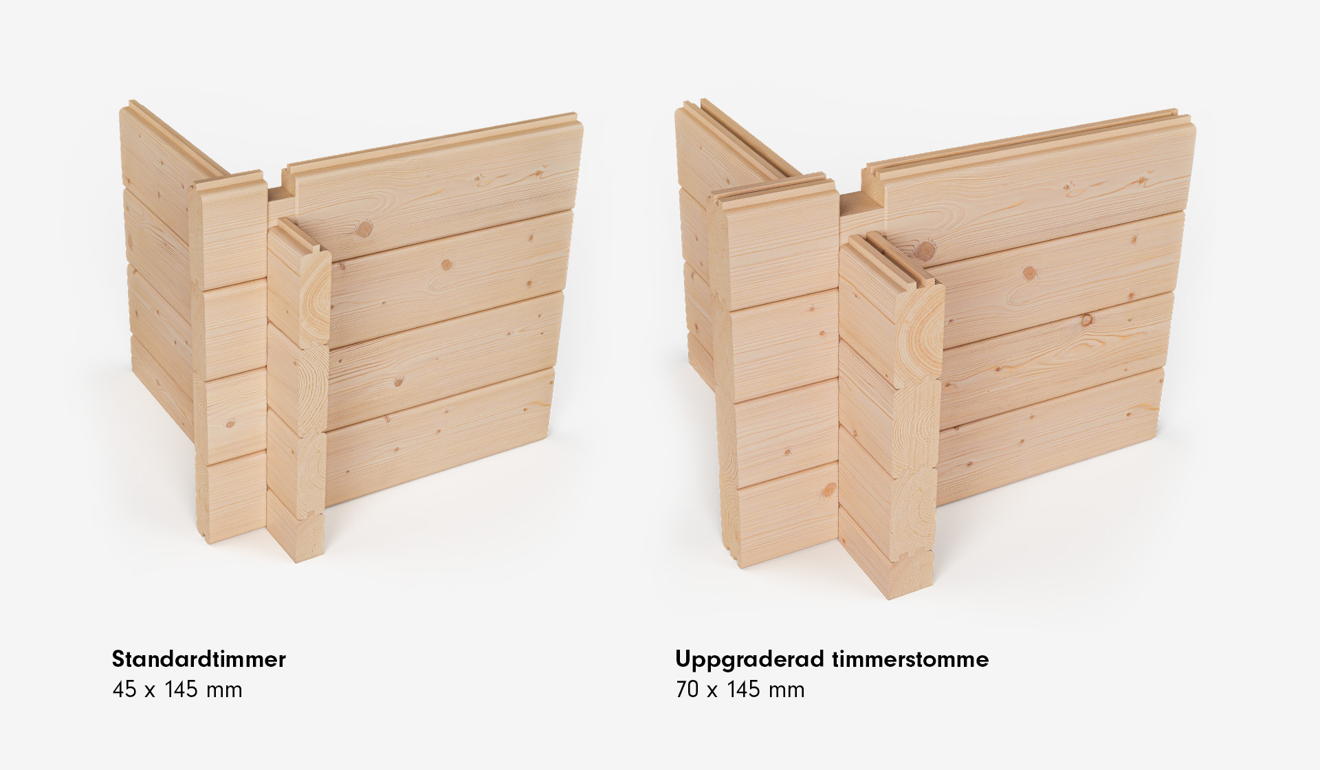 Med vissa av våra knuttimrade stugor har du möjlighet att uppgradera timmerstommen från 45 mm till 70 mm. Se vilka modeller som kan uppgraderas i produktfiltreringen under "Byggkonstruktion".